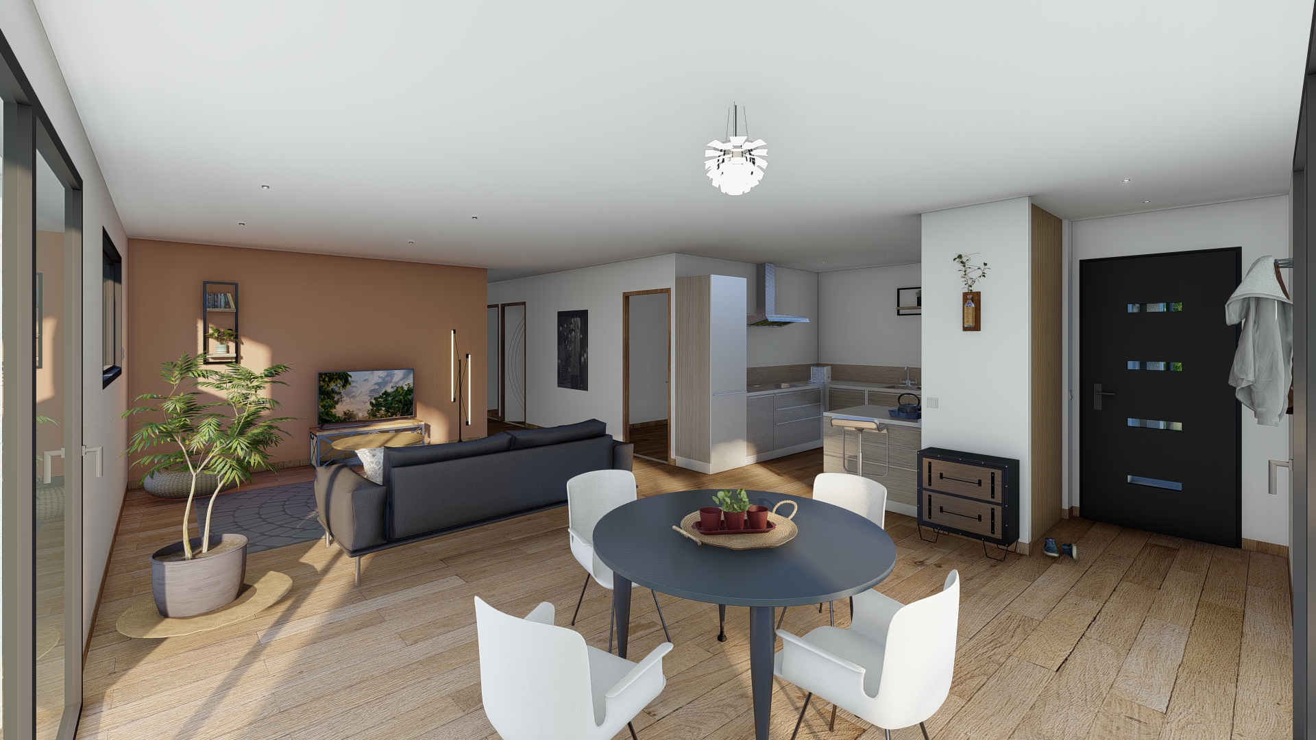 Une spacieuse pièce de vie de 48 m², 3 chambres avec emplacement placard prévu dans chacune d’elles, un cellier, une salle d’eau et des wc séparés.