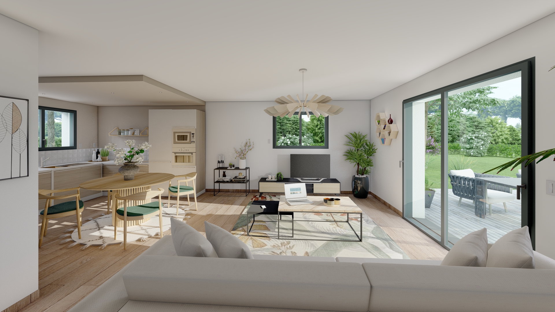 Le modèle Ouessant propose une belle pièce de vie lumineuse de 38 m², une salle de bains, 3 chambres et un garage de 17 m².
